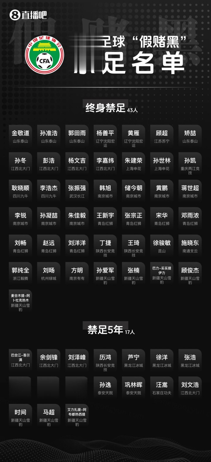 23:终身禁止原南京城市球员孙凝喆从事任何与足球有关的活动。