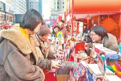 2月12日,市民和旅客在隆福寺新春市场前选购文创产物。