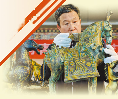 河南伊川县洛阳烟云涧青铜小镇,使命主说念主员方长勋在计帐青铜器马。