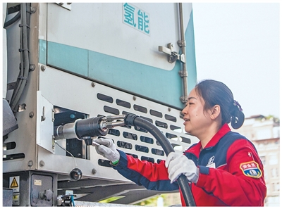 重庆九龙坡区,加能站责任主谈主员为氢燃料电板汽车加注氢燃料。