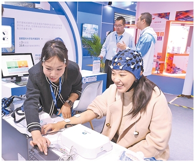 北京齐门国外会展中心,参不雅者体验高性能脑机接口成就。