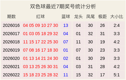 上期双色球的开奖号码中,龙头凤尾组合为15+32,极距为17,大小比为5:1。