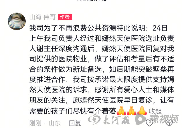 24日上午,该场地企业负责人在社交平台评论区回复称:嫣然天使医院经过评估考量后认为该处有不适合的条件做新址备选,如后期能突破壁垒再度推进合作,将按承诺最大限度提供支持嫣然天使医院的诉求。