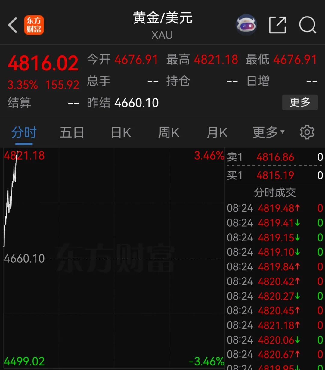 2月3日早盘,黄金、白银双双反弹。现货黄金日内涨幅扩大至3.35%,报4816.02美元/盎司。