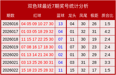 上期双色球的开奖号码中,首尾组合为15+32,跨度为17,质合比为1:5。