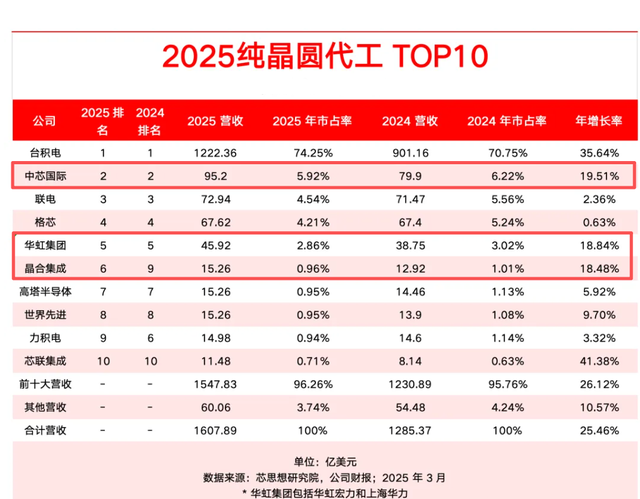 2025年,全球的芯片代工场,其实都发挥可以,具体的前10大纯晶圆代工场(不含三星、英特尔等IDM企业)的排名,如下图的所示。