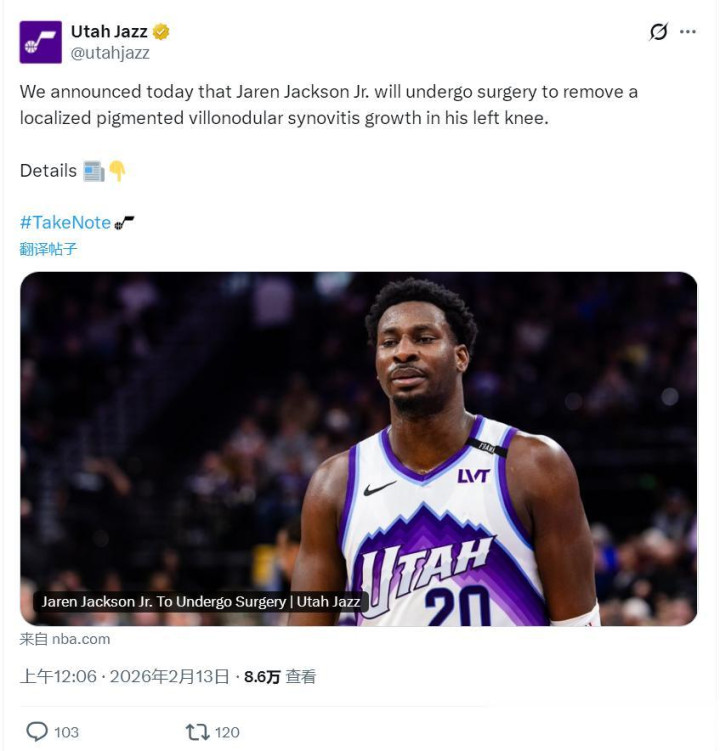爵士官宣,开云app3J将采纳手术治愈,切除他的左膝局部色素绒毛结节性滑膜炎增生,赛季报销。