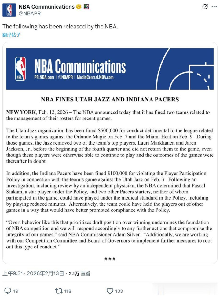爵士被罚金50万好意思元,走路者被罚金10万好意思元,因为他们王人违法提前换下大略径直轮休主力球员,影响了NBA的比赛质地。