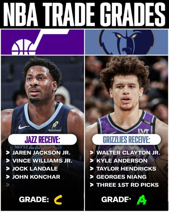 爵士作念了一笔7换4的大来往,他们送出小克莱顿、李凯尔、亨德里克斯、乔治·尼昂和3个首轮签。,从灰熊得到小贾伦·杰克逊、康查尔、兰代尔和小文斯·威廉姆斯。这笔来往的要点虽然是小贾伦·杰克逊。