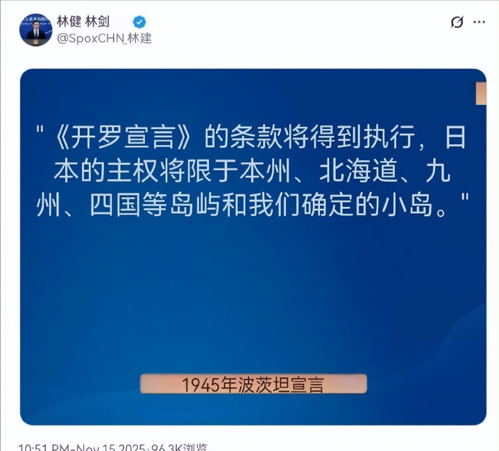 2025年11月15日,外交部发言人林剑在社交媒体上发布《波茨坦公告》第八条内容,并配文:“日本政客该补补历史课了!”此举直击要害,让国际社会看清日本言行与历史文件的巨大背离。